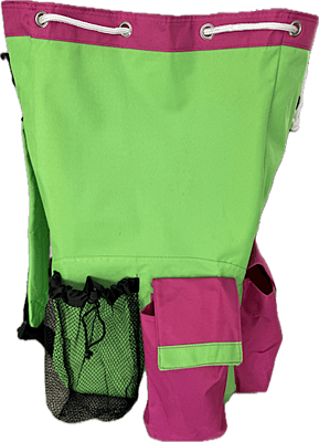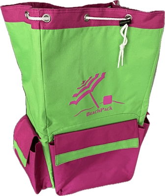 (12 x 12 x 24") This large size easily fits 4-6 beach towels and is great for families and groups. All of our Beachpacks have those great pockets inside and out to organize and store all your items, and adjustable, padded straps on the back for convenient back pack style transport. The flat bottom provides support to stand upright and open for easy packing and unpacking, but also folds flat for storage. Includes interior key holder and exterior mesh bag. Drawstring Closure.