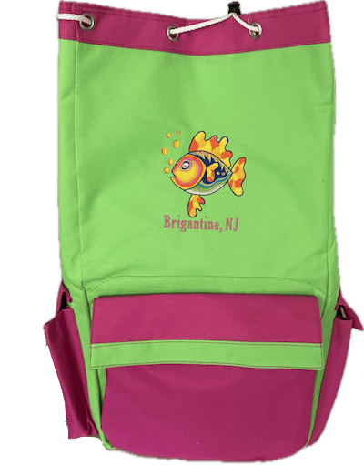 Mega BeachPack in Tropical Punch embellished with our Colorful Fish design on the front and Brigantine, NJ.