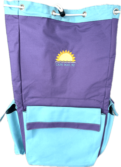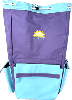 Mega BeachPack in Twilight Dream embellished with a setting sun over Cape May, NJ. This large size easily fits 4-6 beach towels and is great for families and groups. All of our Beachpacks have those great pockets inside and out to organize and store all your items, and adjustable, padded straps on the back for convenient back pack style transport. The flat bottom provides support to stand upright and open for easy packing and unpacking, but also folds flat for storage. Includes interior key holder and exterior mesh bag. All bags are made with mildew resistant polypropylene and are fully lined. (12x12x24")